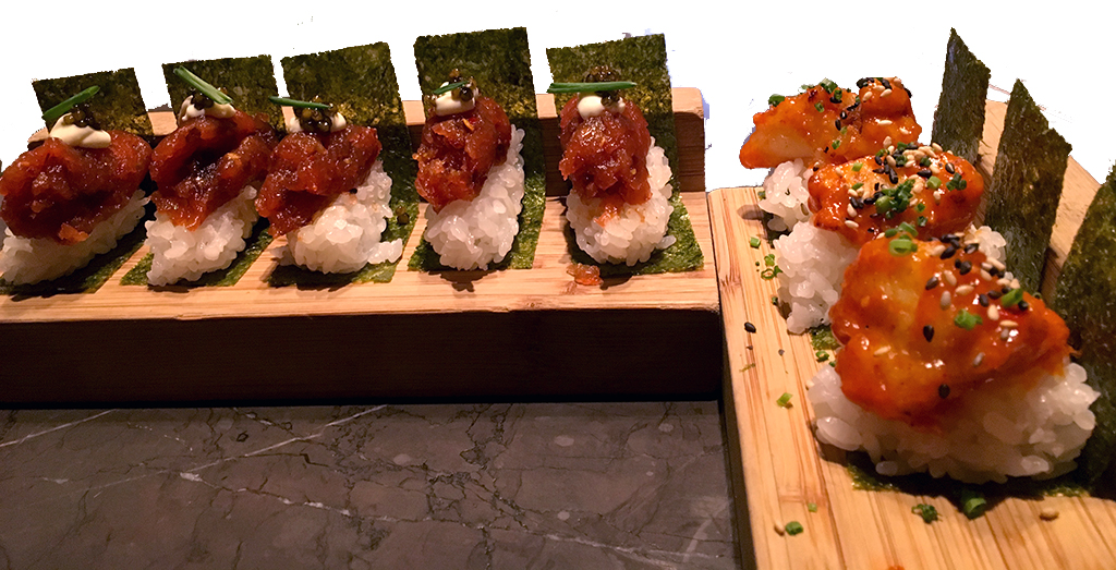 חמש חתיכות “ניגאקי”. התפריט מגדיר את הניגאקי כשמו כן הוא – משהו בין ניגירי למאקי.